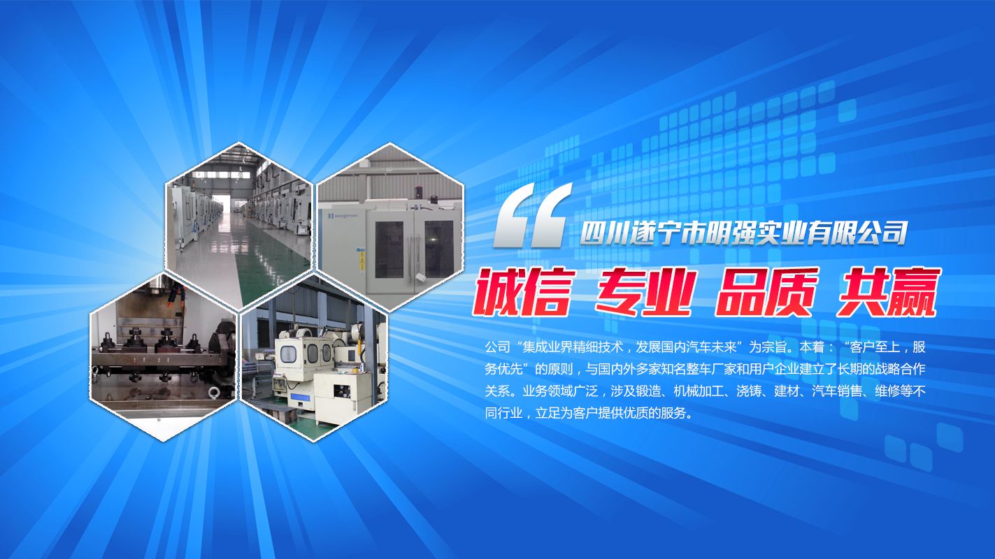 四川遂寧市明強(qiáng)實業(yè)有限公司,成立于1996年,注冊資本金為12764萬元,占地120畝,位于:遂寧市創(chuàng)新工業(yè)園區(qū)南環(huán)路20號,四川遂寧市明強(qiáng)實業(yè)有限公司是一家專業(yè)從事汽車零部件生產(chǎn)、加工、研發(fā)為一體的高新技術(shù)企業(yè)。四川遂寧市明強(qiáng)實業(yè)有限公司擁有現(xiàn)代化的辦公環(huán)境,精良的生產(chǎn)加工設(shè)備,技術(shù)精細(xì)的設(shè)計師及經(jīng)驗豐富的工程師。 四川遂寧市明強(qiáng)實業(yè)有限公司秉承【誠信、專業(yè)、品質(zhì)、共贏】的經(jīng)營理念,為客戶量身定做屬于自己合適的產(chǎn)品。提供滿足客戶需求的技術(shù)支持和服務(wù)。 四川遂寧市明強(qiáng)實業(yè)有限公司“集成業(yè)界精細(xì)技術(shù),發(fā)展國內(nèi)汽車未來”為宗旨。本著:“客戶至上,服務(wù)優(yōu)先…